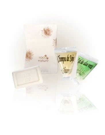3er Set Flacons, bestehend aus Duschgel, Shampoo, Bodymilk im Flakon 35ml und einer Handseife.