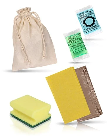Inhalt: Die Bestellung umfasst 50 Reinigungssets. Jede Packung enthält: 1 gelben Putzlappen, 1 blauen Putzschwamm (zerkratzt nicht), 1 Flasche Geschirrspülmittel 30ml & 1 Mülltüte.