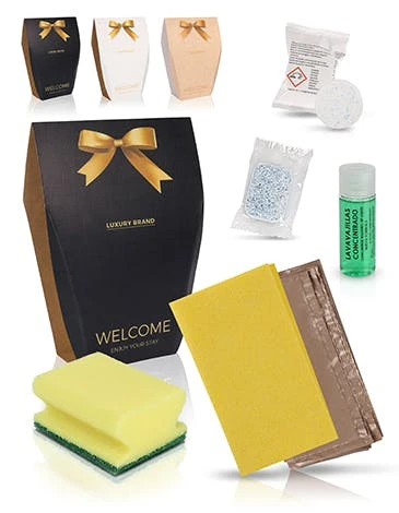 Inhalt: Jede Box besteht aus 4 wesentlichen Reinigungsutensilien in der Küche: 1 gelben Putzlappen, 1 gelben Putzschwamm, 1 Flasche Geschirrspülmittel 30ml & 1 Mülltüte.