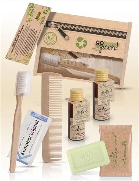 Necessaire bestehend aus Zahnbürste (biologisch abbaubar), Zahnpasta im Sachet, Kamm (biologisch abbaubar), Handseife und Duschgel / Shampoo (2 Sachets). Verpackt in einem Einweg-Necessaire aus Kraftpapier.