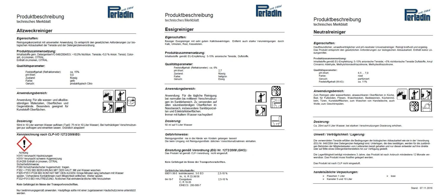 enthält nur Inhaltsstoffe gemäß EG-Empfehlung, ist umweltverträglich und biologisch rasch abbaubar. – Perladin Essigreiniger ist ein besonders umweltgerechter und zugleich sehr universeller Reiniger für alle abwaschbaren Flächen im Haushalt und im Sanitärbereich.